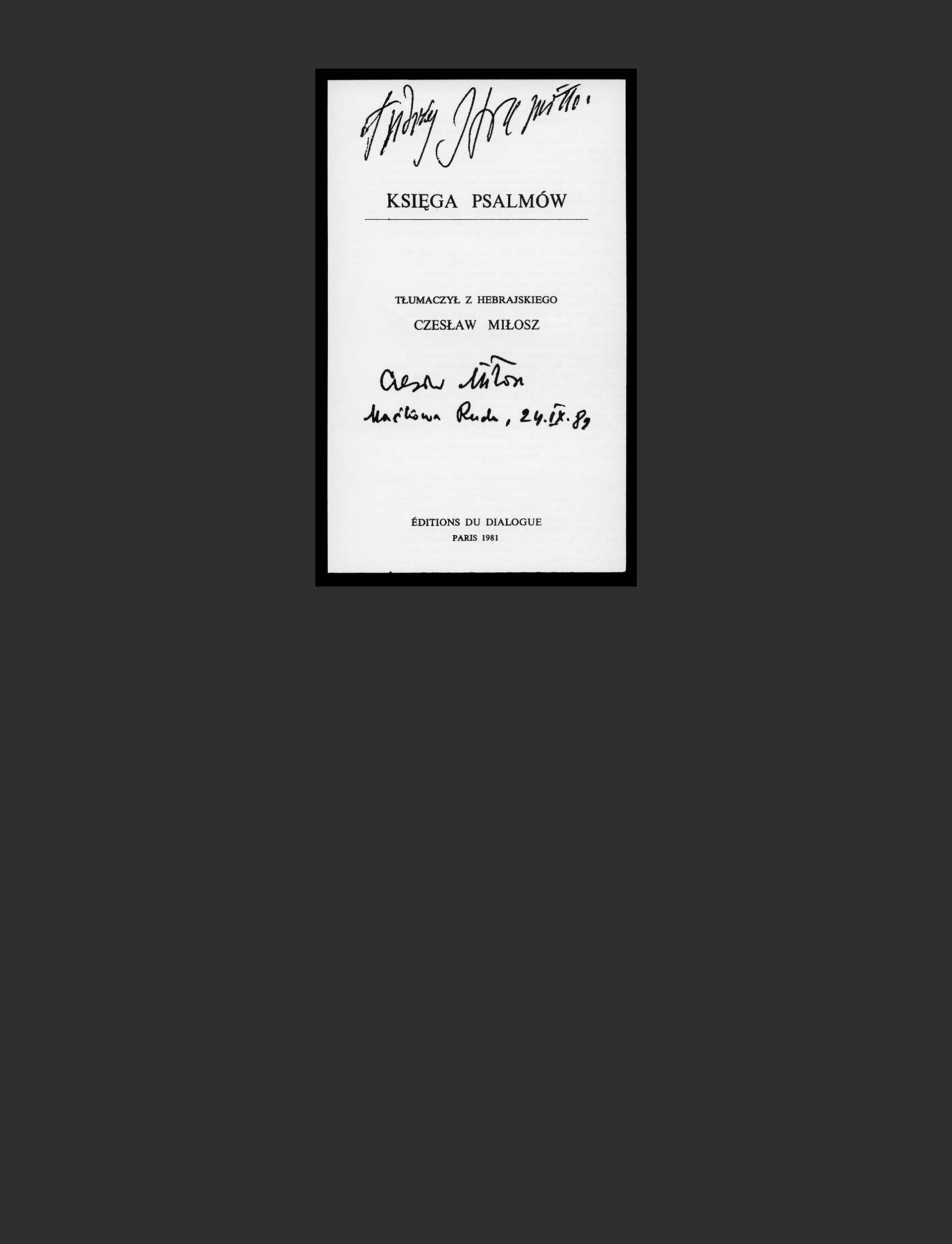 The Psalms are a record of Israel identity. The Psalms, which are a sort of IP of the individual and the nation, superbly express the universal character of human reality as well. That paradox, that contradiction of the concrete and the universal, is only a seeming paradox in the Psalms, as it is the case in each great work of art. Where these two contradictory values appear, a unique, original and universal work is created. I first found inspiration and justification in these words of Father Jozef Sadzik, in his introduction to the most recent Polish translation of the Psalms from the Hebrew by Czeslaw Milosz, published by Editions du Dialogue, Paris 1979.